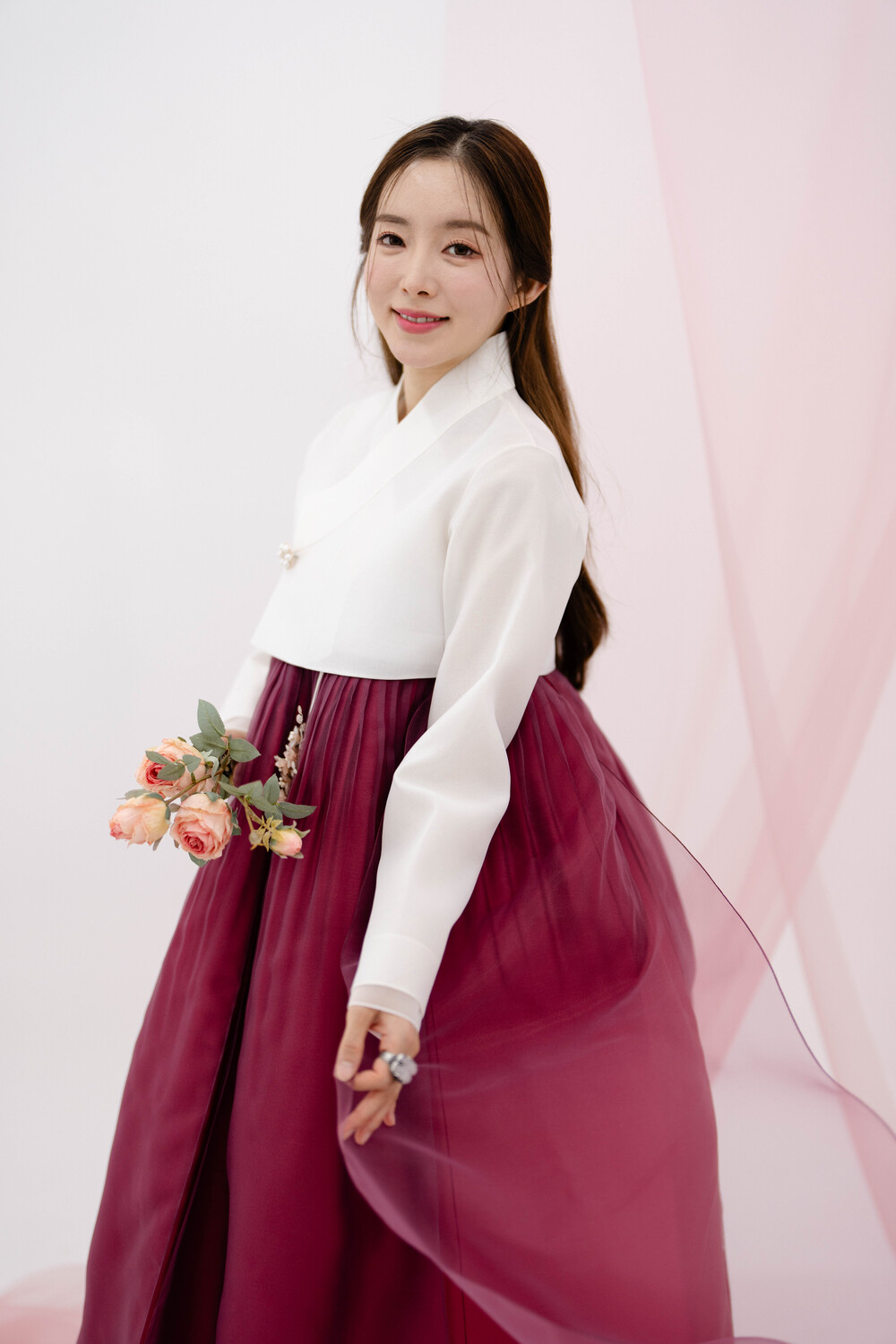 진한 와인색 원단에 어울리는 붉은톤 시스루를 덮어서 부드럽게 떨어지는 느낌을 강조했습니다.