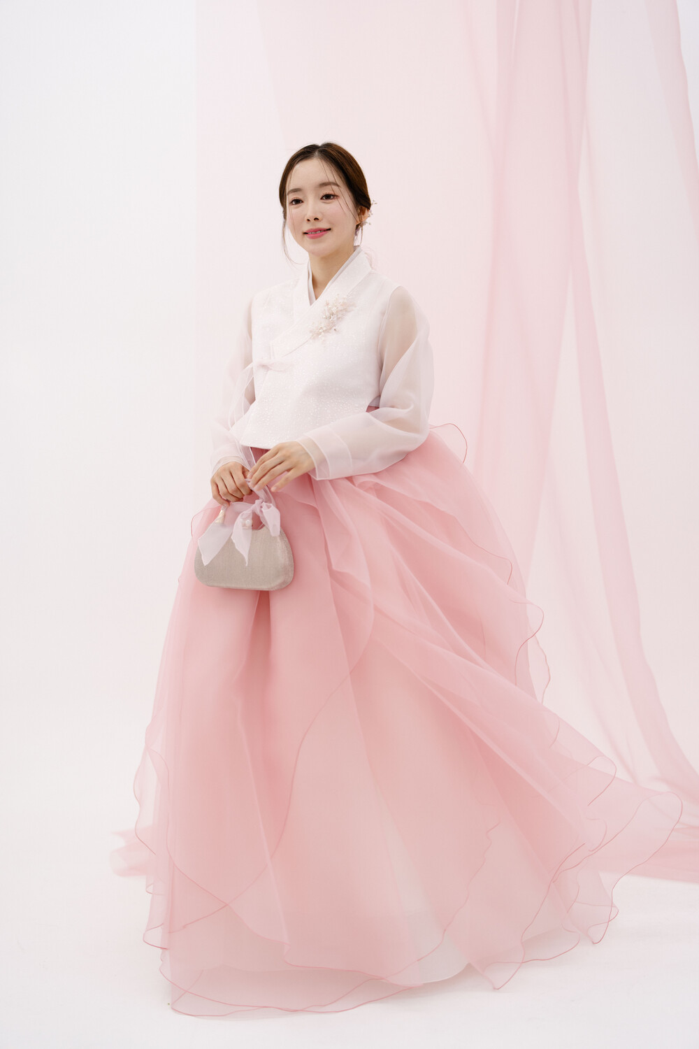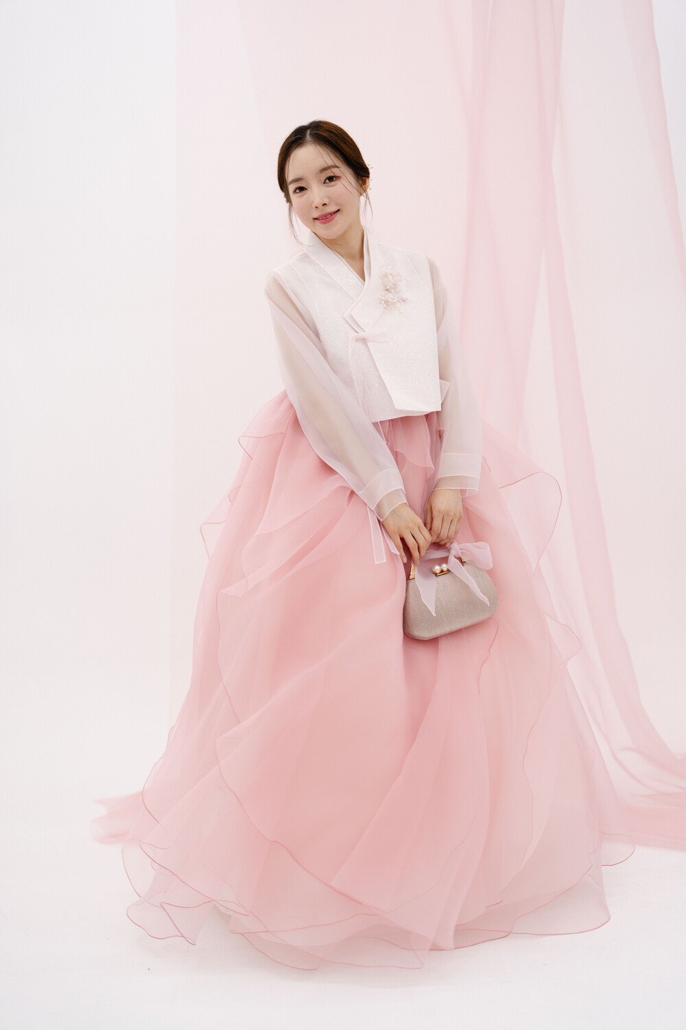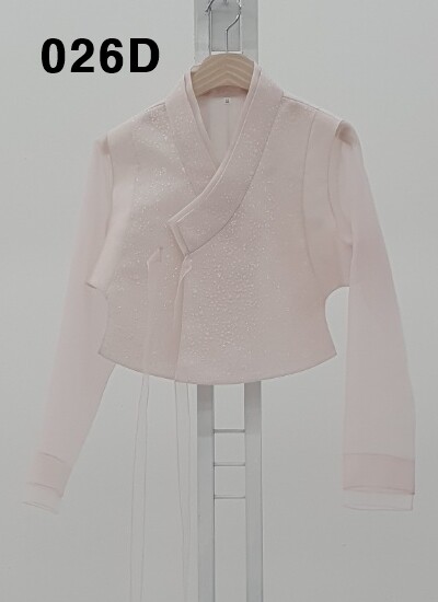 연핑크 소매시스루에 땡땡이 레이스가 귀여운 미니 당의 입니다.