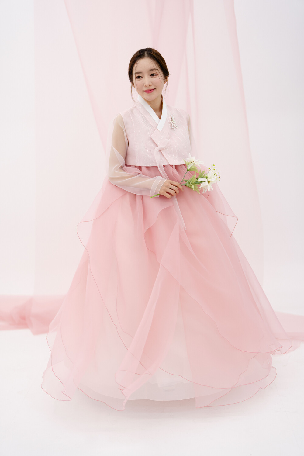 연핑크 소매시스루에 땡땡이 레이스가 귀여운 미니 당의 입니다.