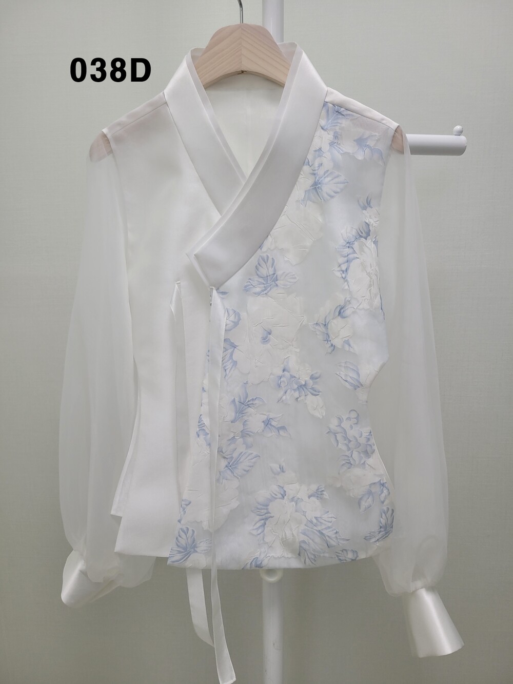 하늘색 꽃나염 원단을 사용한 화려한 꽃무늬 당의 입니다.