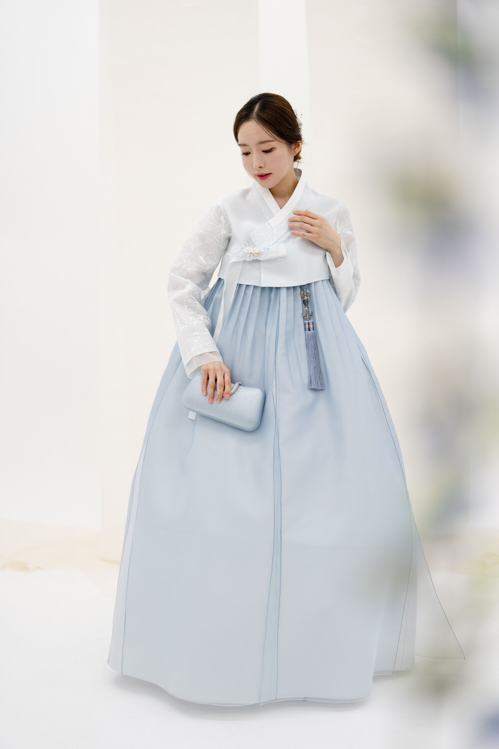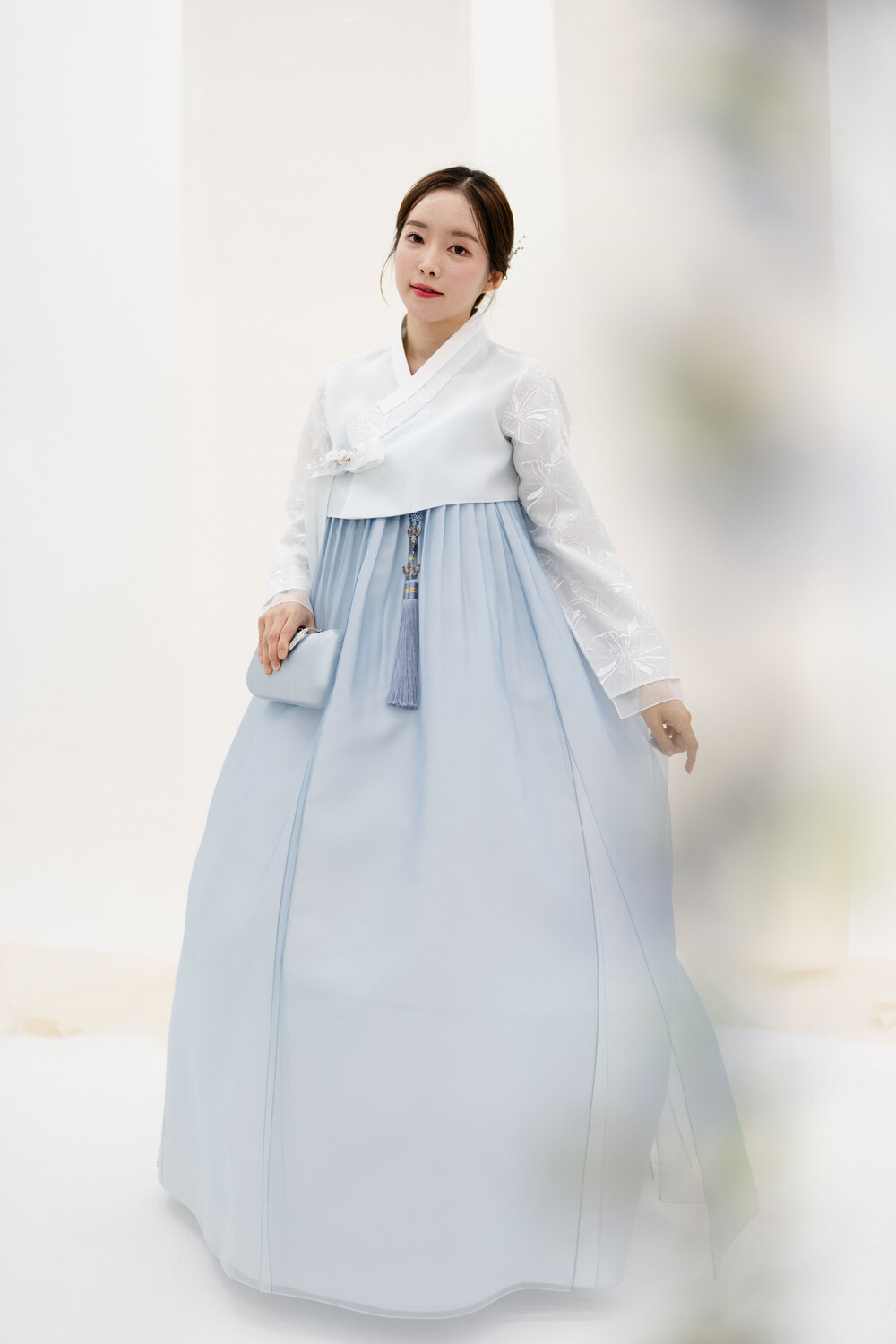 깃,팔부분 레이스가 아름다운 하늘색 저고리 입니다.