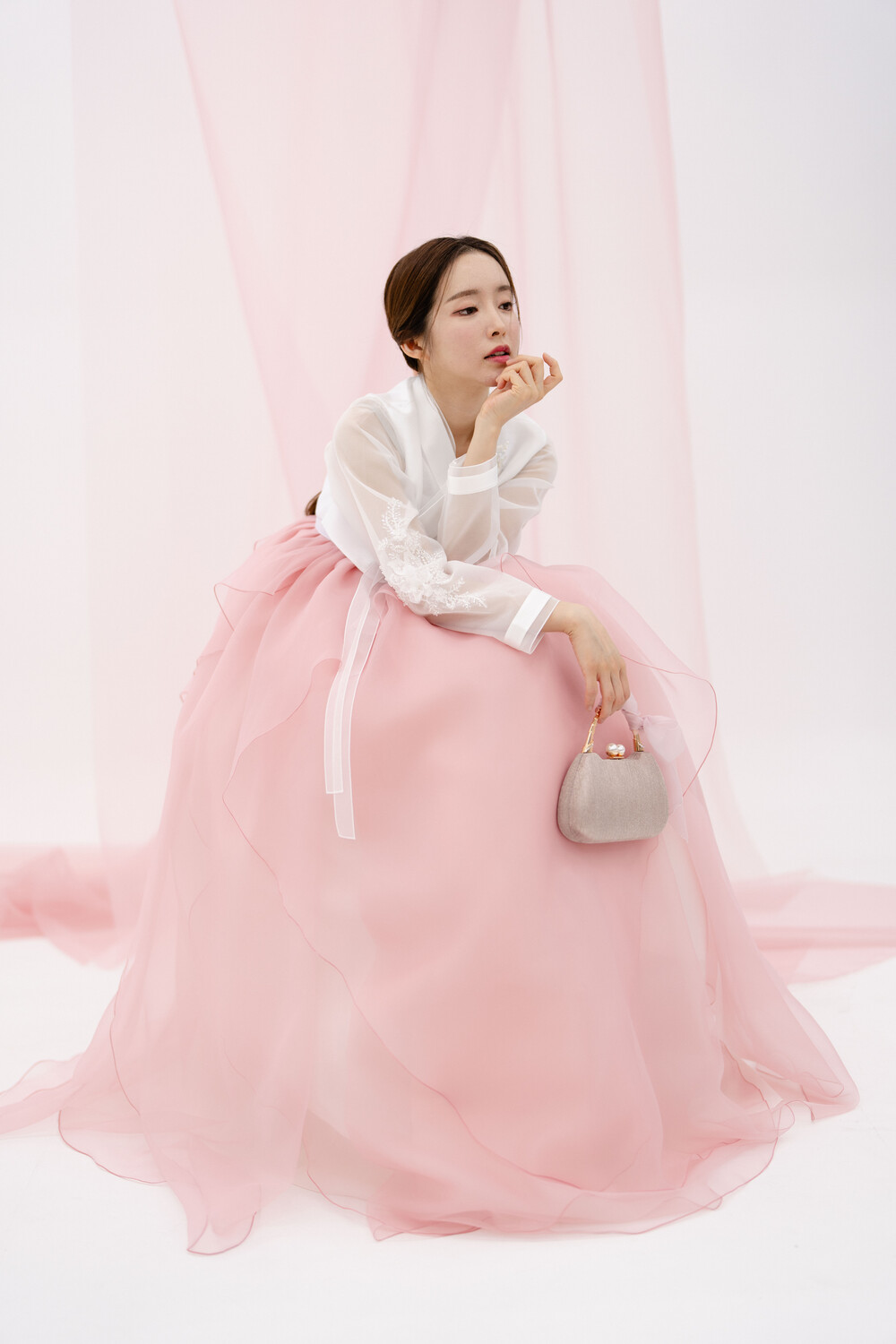 팔 시스루 부분의 꽃패치가 포인트인 저고리 입니다.